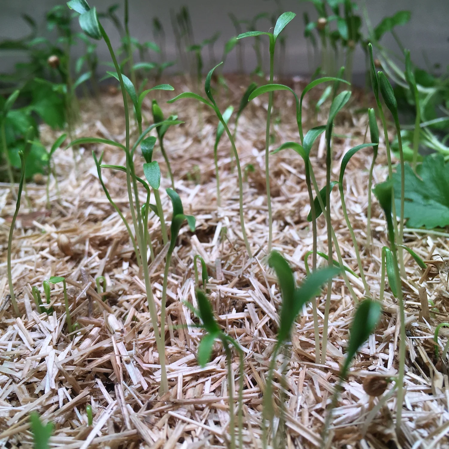 For longer-lasting herb crops, we use a fine, light mulch to protect the agar from too much light, which eventually turns green. Mulching also reduces evaporation of the agar and allows the seed to germinate in the dark (no need for a cover). Mulching also supports the stem, but cilantro doesn’t hold its shape very well when growing; its stem is very thin.