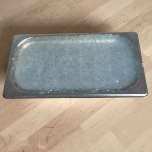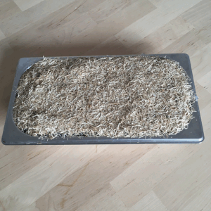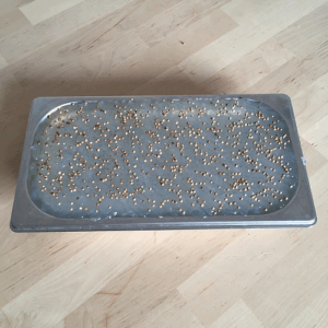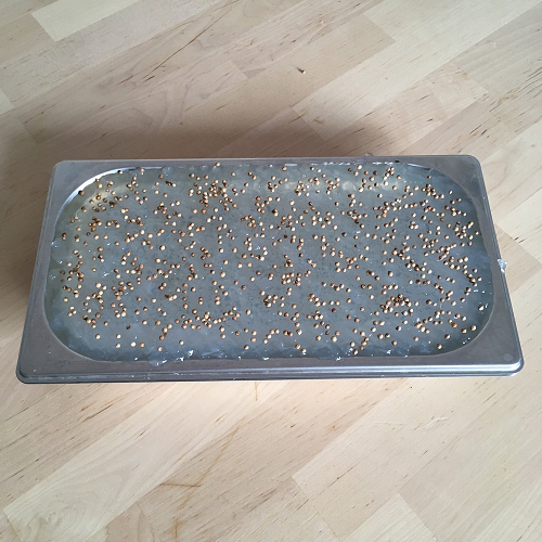 For growing coriander, we use exactly the same agar-agar as for growing microgreens. However, we fill the perforated tray to the brim. In hot weather, you can proceed as for growing basil by doubling the agar. At this stage, you can broadcast your coriander seeds fairly tightly. For the small vegetable garden tray, we use a large tablespoon of seeds (15 ml).